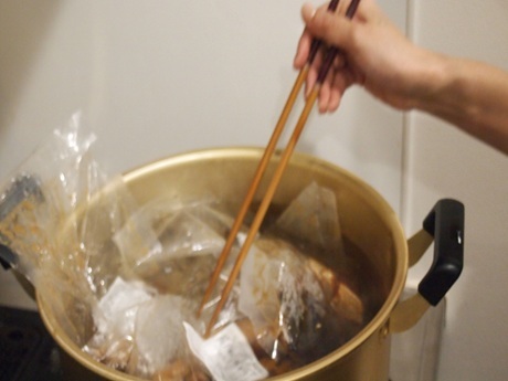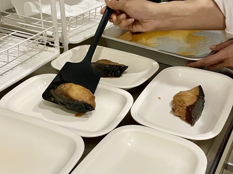 湯煎、解凍した食品をお皿に丁寧に盛り付けた後
